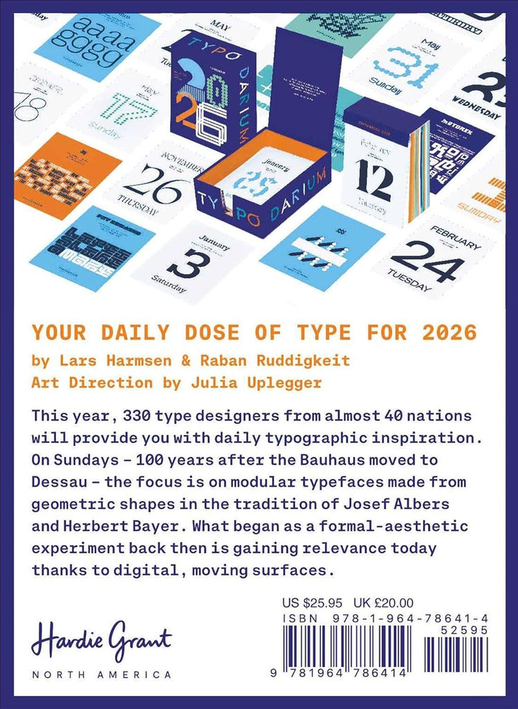 Perfect for keeping the design-minded person inspired throughout the year, the Typodarium is a colorful tear-off desk calendar that delivers a daily dose of type in a decorative format. With 365 fonts by 329 type designers from 41 countries, this beautifully designed calendar comes neatly packed in its own box and is made to sit on your desk or shelf with a cardboard easel backer. Typodarium has 384 tear-off pages with a day and date reference on each page and includes major world holidays.