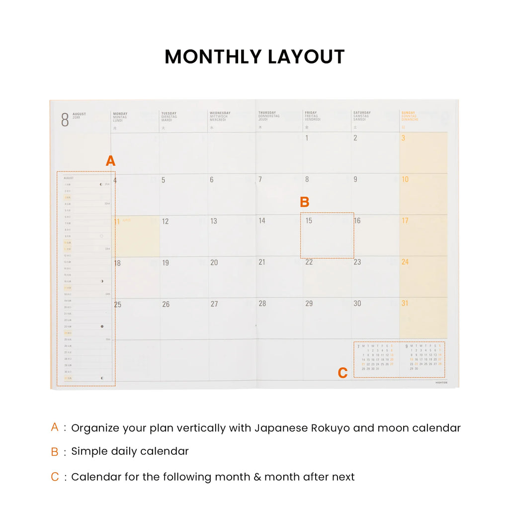 - Sundays and holidays printed in distinctive yellow for easy differentiation from weekdays.