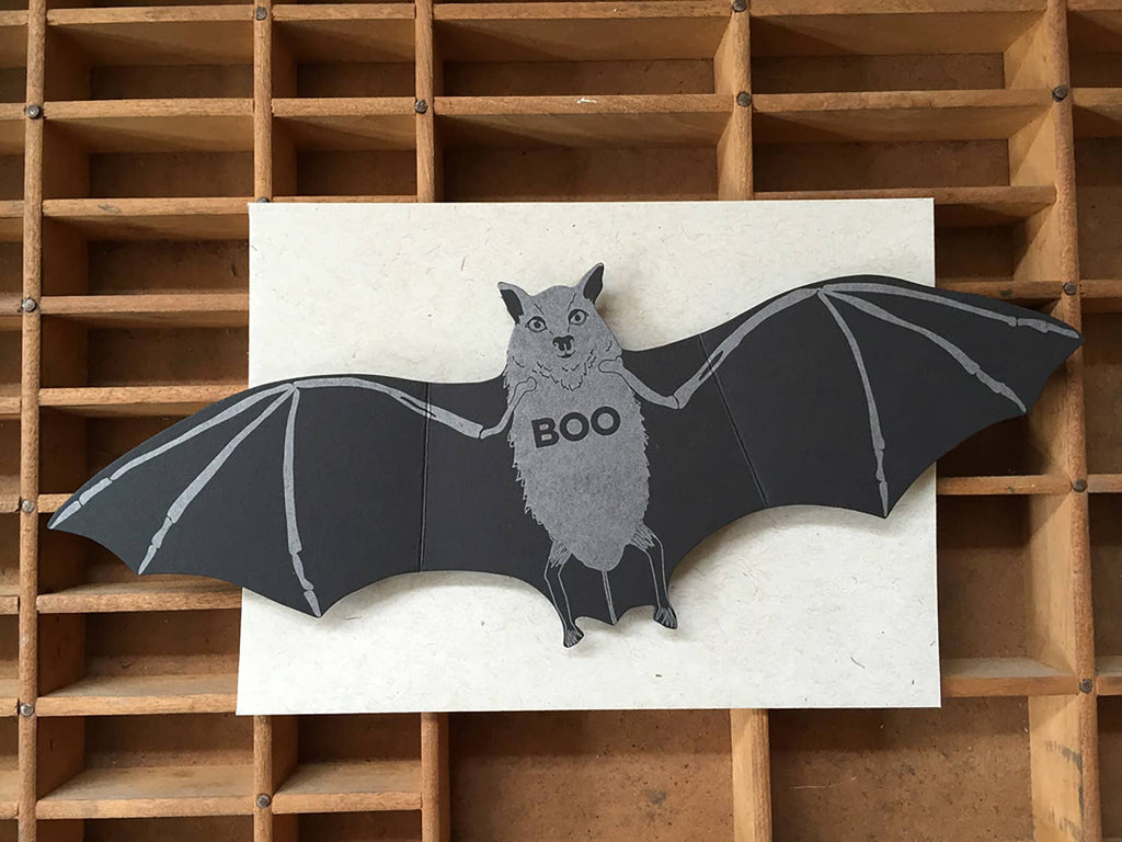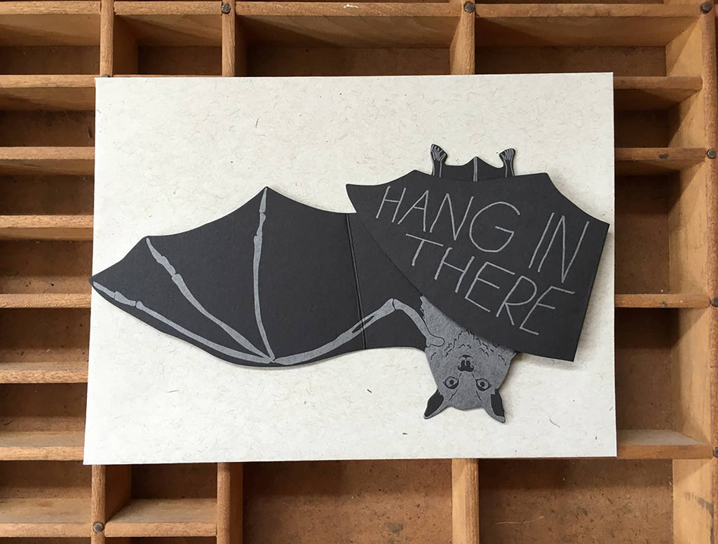 Hang in there, just like the bats do. It is packaged upside down (hanging) with "hang in there" printed on one folded wing. If you open its wings you will see "BOO" inside it's body. The other wing will fold as well.