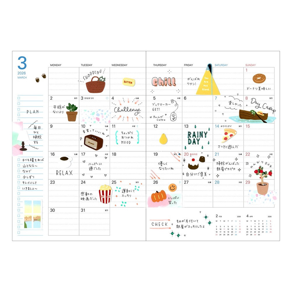 The monthly pages have one square per day, making it easy to see your schedule at a glance. The A5 size has large squares, making it easy to write down your plans, so it's recommended for people who want a spacious planner. The large squares are dot-ruled to make it easier to fill in. The second half of the planner is an 89-page grid notebook in the same refreshing light blue as the monthly pages. For those who want a slim notebook but find it bulky to carry both a planner and a notebook, this is the perfect number of pages to use as both a planner and a notebook all year round.