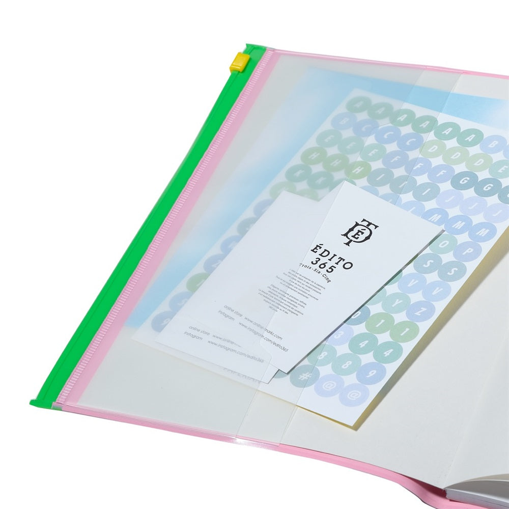 The sliding zipper cover can hold stationery like sticky notes and pens, as well as personalized accessories like tickets, photos, and postcards.