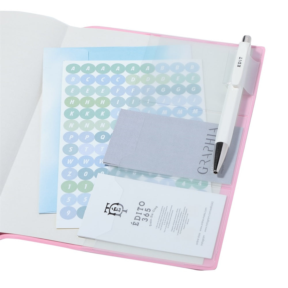 The interior also features a business card-sized card pocket and pen holder, allowing you to store your favorite writing implements and cards in a personalized way. Furthermore, the PVC cover is partially made from recycled PVC.